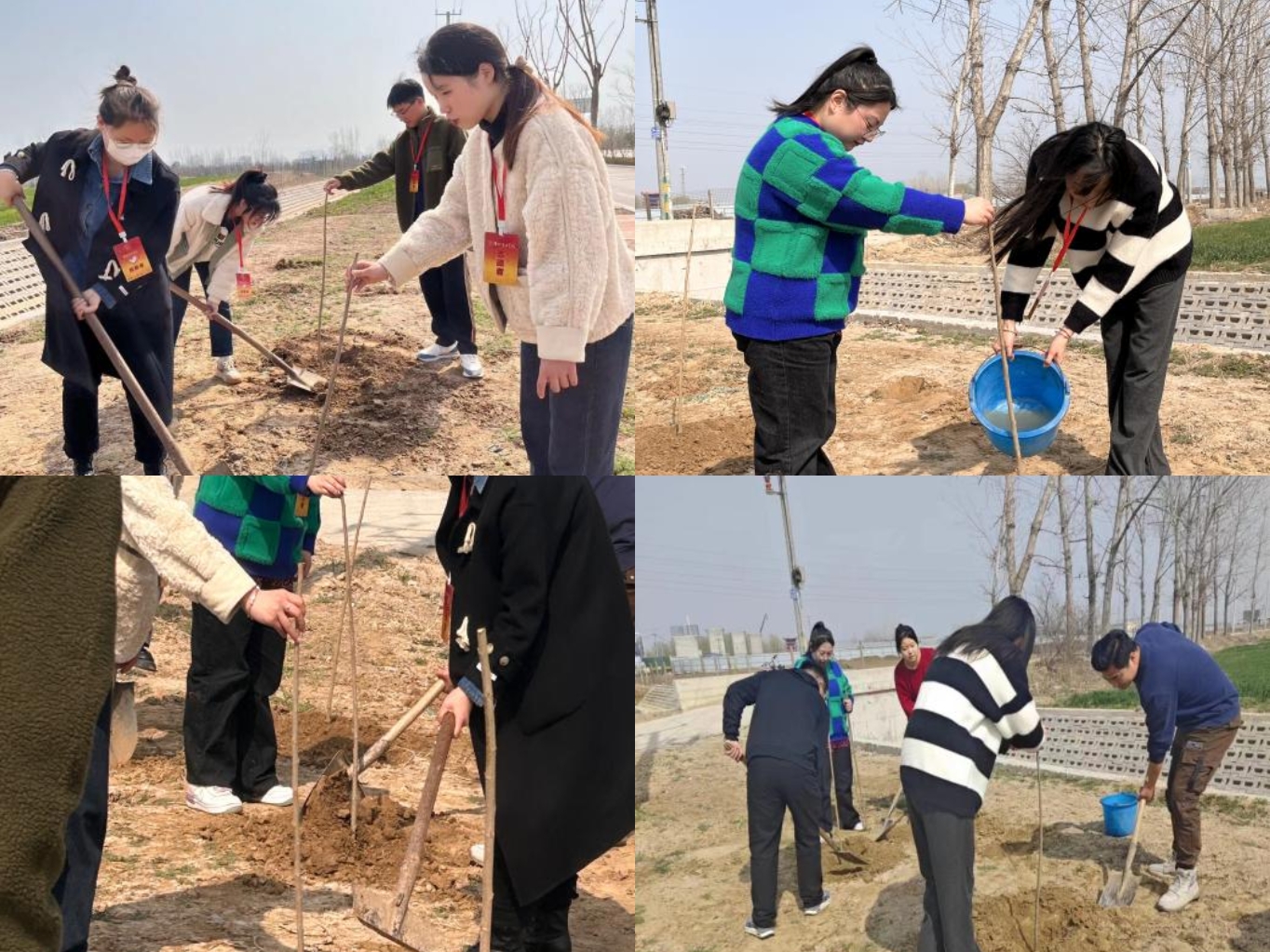 春风浩荡满目新,扬帆奋进正当时。到达目的地后,同学们顾不上休息,扛上树苗、铁锹,提着水桶就开始干了起来。在植树现场,大家热情洋溢,分工明确,团结协作,干劲十足,或两人一组,或三人一群,有的挥锹铲土,有的扶正树苗,有的填土培土,有条不紊地栽培树苗,最后为树苗浇灌河水,期待着它们早日成活,为绿色低碳之城——美丽淮北增添一片新绿。
