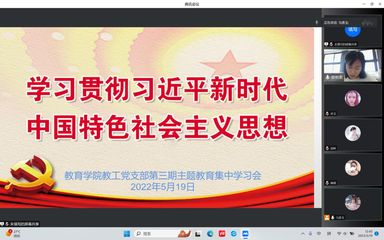 5月19日下午,太阳成集团tyc41183学习贯彻习近平新时代中国特色社会主义思想主题教育开展第三期读书班党课学习,本次学习会以“线上课堂”形式举行,由教工党支部委员邵和君同志主持并领学。