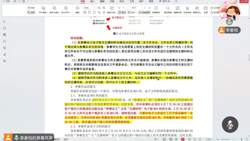 其次,在团队协作与分工注意事项方面,李老师建议学生团队提前明确“建模者、编程者、写作者”的核心分工,避免分工模糊导致效率低下,并提醒团队在竞赛中及时沟通进度,防止因信息差出现模型与论文脱节、计算结果错误等问题。在作品提交方面,李老师强调,团队需明确提交文件类型、命名规则及逾期提交后果,特别强调禁止抄袭、数据造假等违规行为。