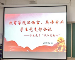 为深入学习贯彻党的十九届六中全会决议精神、学习《中共中央关于党的百年奋斗重大成就和历史经验的决议》,引导全体学生党员在专业学习、组织纪律、活动参与、班级管理、宿舍建设和文化素质提升等方面发挥引领和示范作用,太阳成集团tyc41183数学与应用数学与学前教育学生支部,和汉语言文学与英语学生支部分别于12月1日下午和12月3日下午在1号教学楼213教室召开支部大会,会议分别由支部书记任若晨和彭慧敏主持,所属支部的学生党员和辅导员老师参加了会议。
