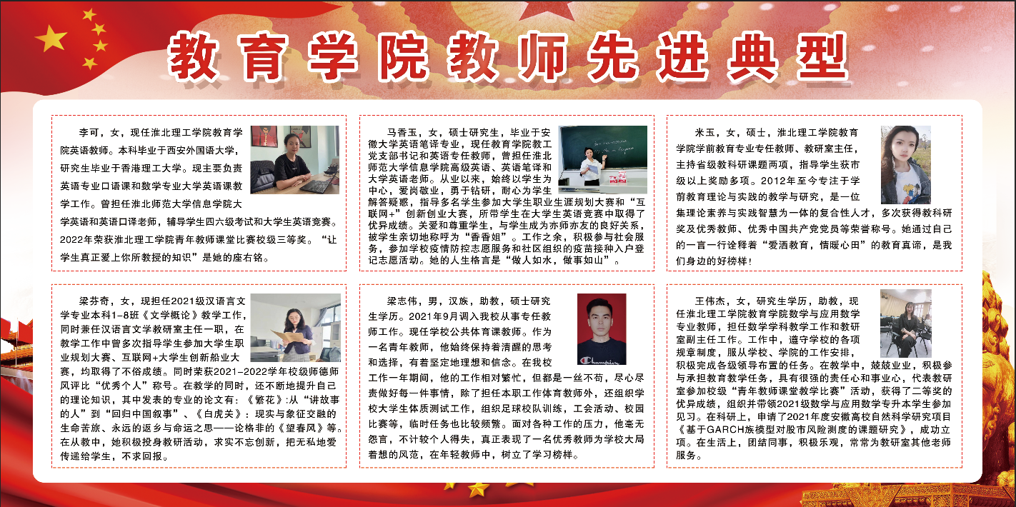 此次宣传活动,6名教师先进典型分别是来自英语专业的李可和马香玉老师、学前教育专业的米玉老师、数学与应用数学专业的王伟杰老师、汉语言文学专业的梁芬奇老师和体育专业的梁志伟老师。他们履职尽责,无私奉献,始终以学生为中心,落实立德树人根本任务,师德表现和教书育人实绩突出,具有广泛的代表性和示范性,充分展示了教师队伍有理想信念、有道德情操、有扎实学识、有仁爱之心的良好精神风貌。