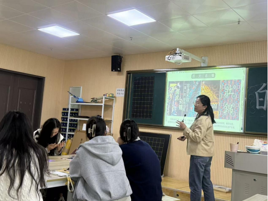 随后,指导老师张晓婷为支部党员们带来了一场生动详实的宋锦文化知识讲座。张晓婷老师从宋锦的历史渊源、艺术特色、织造工艺及其在中华丝绸文化中的重要地位等方面进行了深入浅出的讲解,并展示了精美的宋锦实物样品。她强调,宋锦不仅色泽华丽、图案精致,更蕴含着深厚的文化底蕴和吉祥寓意,是传统美学与精湛技艺的完美结合。