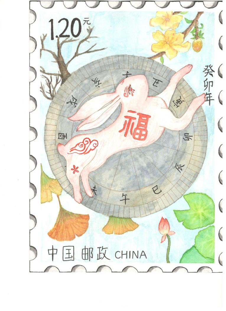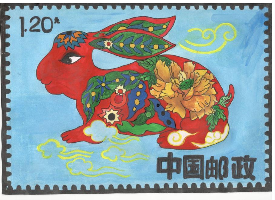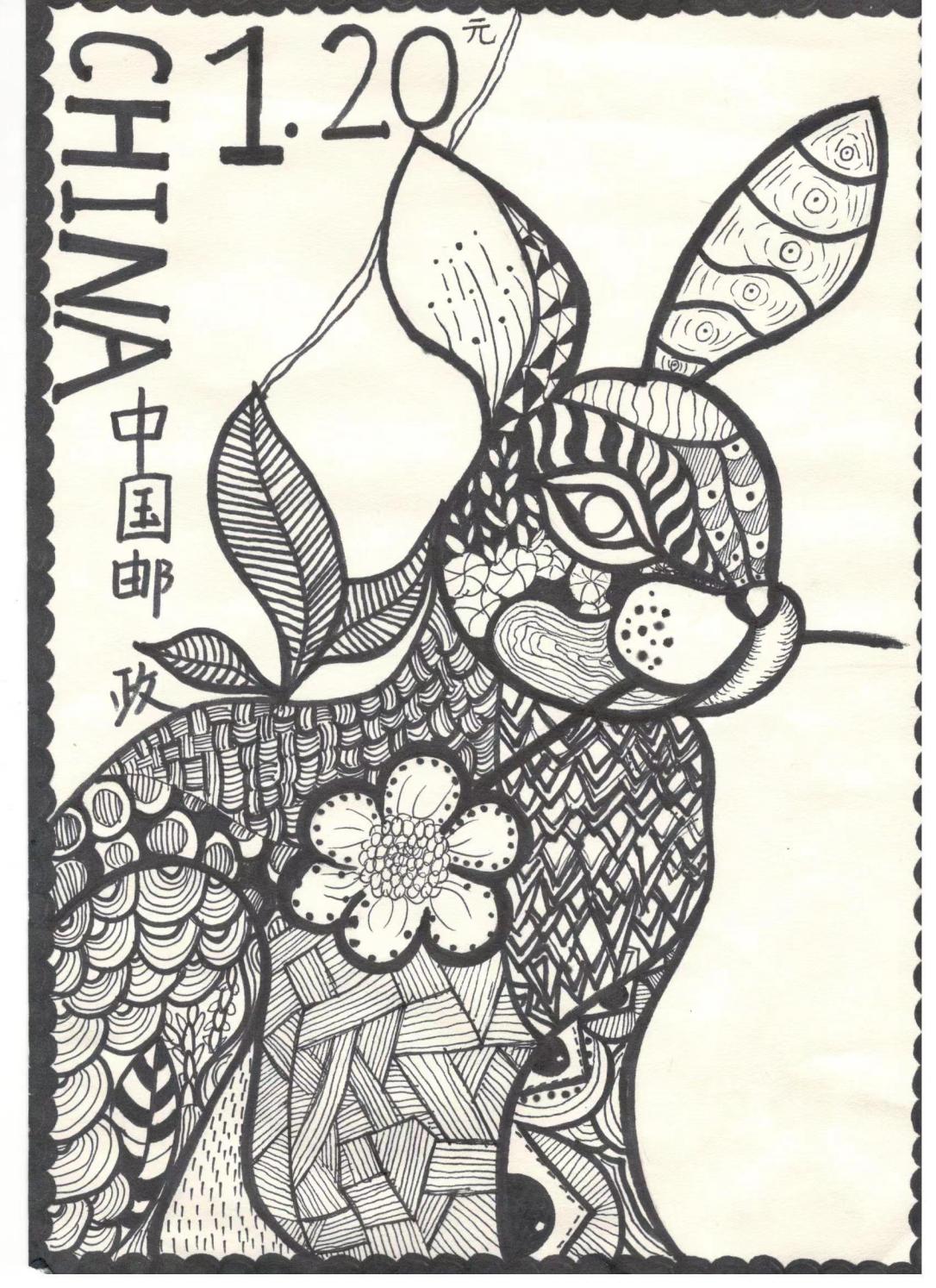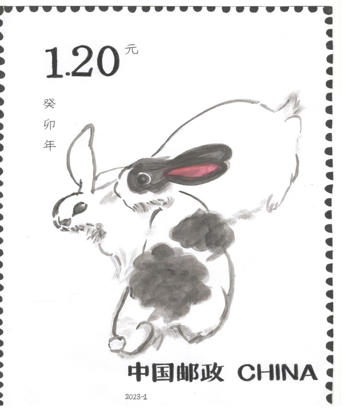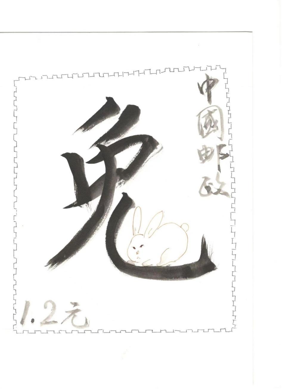 介绍:我的作品是以汉字兔为构想基础,将绘画与汉字融合。契合了兔子娇小的身材特点,将兔字中点化成兔子。同时,邮票设计采用黑白是想符合中国传统水墨丹青的特色,符合比赛主题。