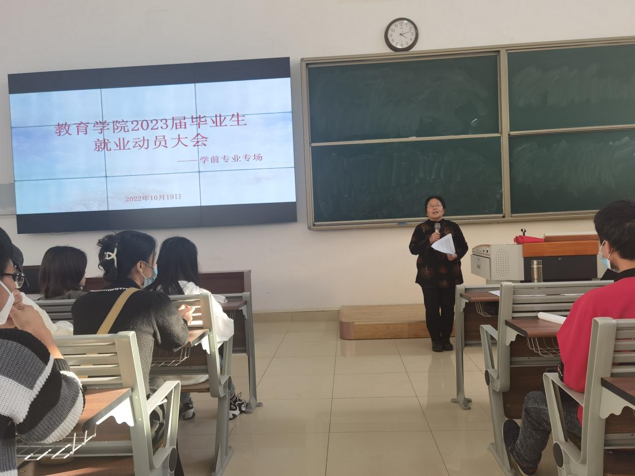2022年10月19日下午,我院在教学楼121教室召开2023届毕业生就业动员大会。为帮助2023届毕业生准确有效地确定就业方向,尽快地让同学们在思想、行动上早做准备,指导毕业生如何走好从大学走向社会的重要一步。太阳成集团tyc41183王家云院长、孟向红副书记及学前教研组老师出席本次会议,2023届太阳成集团tyc41183学前教育专业全体毕业生参加会议。会议分两场进行,分别由太阳成集团tyc41183学前教育专业辅导员任若晨、侯莉萍主持。