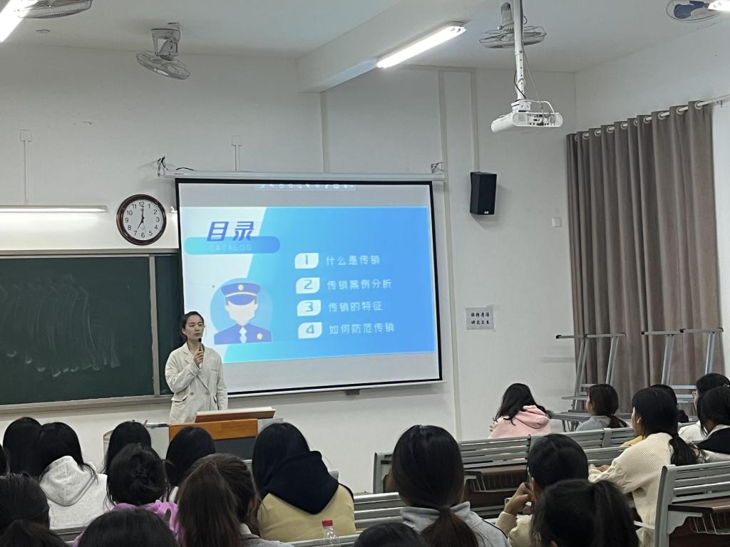 主题班会上,辅导员老师们就传销的概念、传销的途径、传销的产业链,以及如何防范和抵制传销,以PPT形式进行了宣传和预防教育,告诉同学们要擦亮双眼,警惕网贷和校园传销等不法行为,通过主题班会大家收获了预防传销的知识。