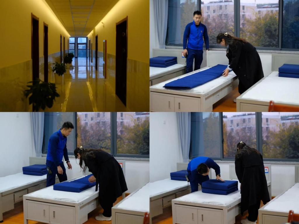 随后,同学们还参观了消防员的寝室环境。进入消防员们的宿舍,每张床上的被子都叠得整整齐齐,是一个个标准的方块被。床单十分平整,没有一道折痕。桌子上的杯子自然排成一列,杯把不约而同的朝着一个方向。地上看不到一点灰尘,消防员们的内务整理的既干净又整齐,同学们情不自禁发出啧啧的赞叹。消防员们向同学们展示了叠豆腐被技能,并指导同学们进行叠豆腐被。消防员告诉同学们良好的习惯养成很重要,看起来难的事情只要坚持,重复多次就能熟练起来了,“世上无难事,只怕有心人”。