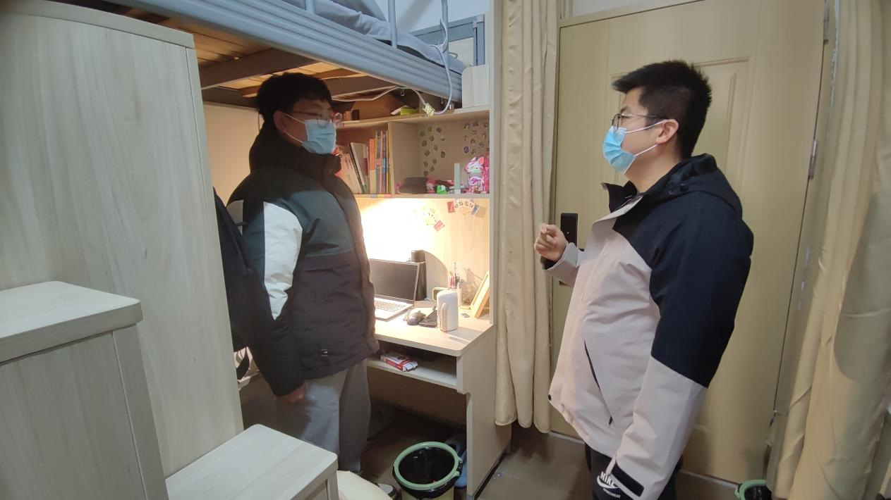 与同学们交流时,辅导员建议大家建立宿舍卫生值班制度,自觉强化个人卫生管理,自觉维护公共卫生秩序。