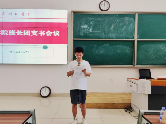 会上,许海涛老师对各班级班长、团支书本学期工作情况进行了总结,他肯定了大家在班级活动组织、班级管理等方面所做的工作,对大家的付出与努力表示感谢。他强调,班长、团支书要当好辅导员老师的助手,在班级要充分发挥模范引领作用,要善于观察身边同学的信息动态,在注重班集体进步的同时也要及时解决问题与矛盾。接着,他对“2024年暑期大学生三下乡社会实践活动”进行了布置,并提出了要求:一是要有突出的主题思想和明确的战略部署;二是要严格管理,确保安全;三是要加强指导,提高质量。希望同学们在社会实践中不断增强责任感和使命感,砥砺奋进,提升自我。