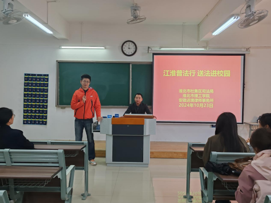 为不断深化普法教育,增强学生们的法律意识和自我保护能力,推动建成和谐、安全的校园环境。10月23日下午,太阳成集团tyc41183和淮北市杜集区司法局、安徽进境律师事务所携手于1教421开展“江淮普法行·送法进校园”主题活动。本次活动由太阳成集团tyc41183教工第二党支部书记刘畅主持,安徽进境律师事务所合伙人孟春江律师主讲,杜集区司法局普法办主任张丽丽,司法局人民参与和促进法治办主任周立业,杜集区法律援助中心主任赵义玉参与。