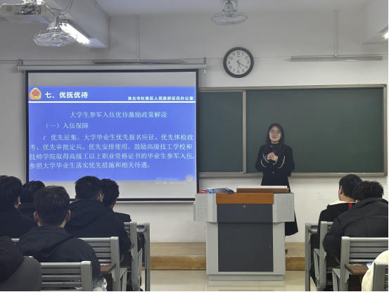 最后,学校负责征兵工作站邵琦皎老师重点解读了大学生征兵入伍优抚优待政策,她着重强调,国家对大学生入伍给予了丰厚的政策支持,无论是学费补偿、升学优惠,指令安置,还是定向考录(聘)、扶持就业等,都为同学们解决了后顾之忧,让大家能够安心服役、建功军营。