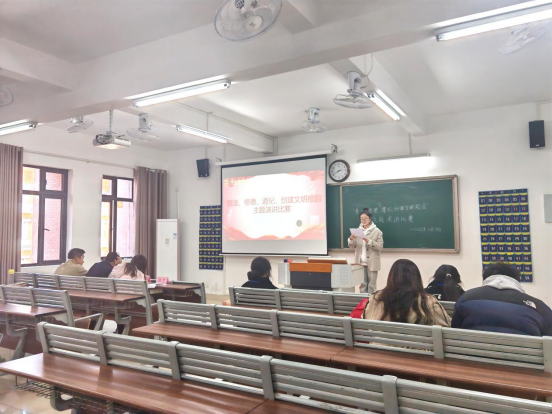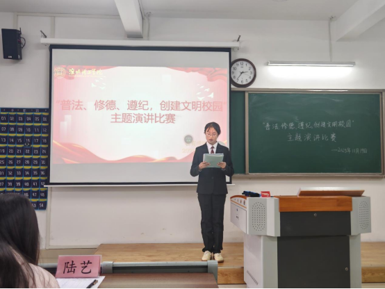 比赛现场秩序井然,选手们依次登台展现风采。他们以“普法、修德、遵纪,创建文明校园”为核心,结合校园日常与成长感悟娓娓道来,或阐述法治对青春的护航意义,或分享修德践行的细微故事,或强调纪律对校园文明的保障作用。他们语言流畅、情感真挚,时而慷慨激昂,时而温和恳切,精彩的表现多次点燃现场氛围,也让“普法、修德、遵纪”的种子在每位观众的心底悄然扎根。